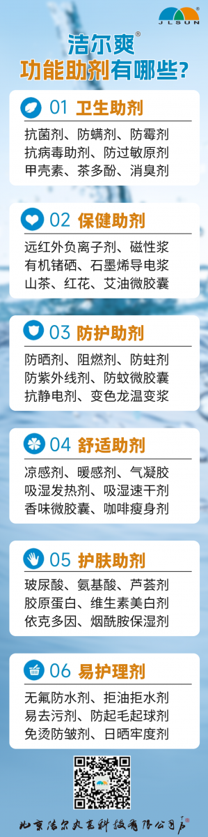 30年來,潔爾爽?®人持續(xù)科技創(chuàng)新,在中國率先投產(chǎn)了紡織品抗菌劑、防螨整理劑、防霉整理劑、防蚊整理劑、防紫外線整理劑、香味微膠囊、維生素整理劑、蘆薈玻尿酸整理劑和純棉無甲醛耐久阻燃劑等。