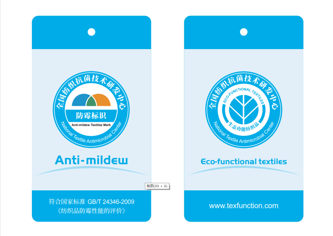 中國紡織工程學(xué)會 全國抗菌技術(shù)研發(fā)中心頒發(fā)的“防霉、抗菌吊牌”