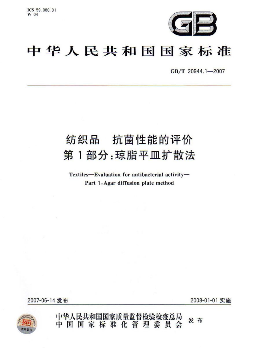 國家標準:GB/T 20944.1-2007(紡織品 抗菌性能的評價)